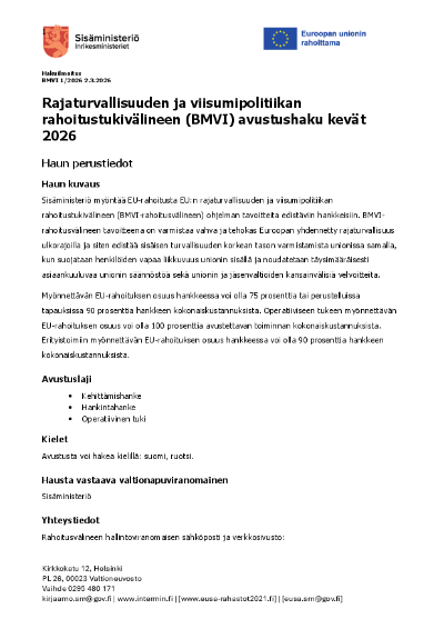 Rajaturvallisuuden ja viisumipolitiikan rahoitustukivälineen (BMVI) avustushaku kevät 2026.
