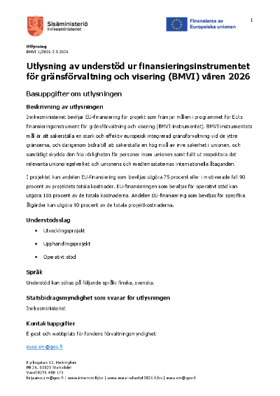 Utlysning av understöd ur finansieringsinstrumentet för gränsförvaltning och visering (BMVI) våren 2026.